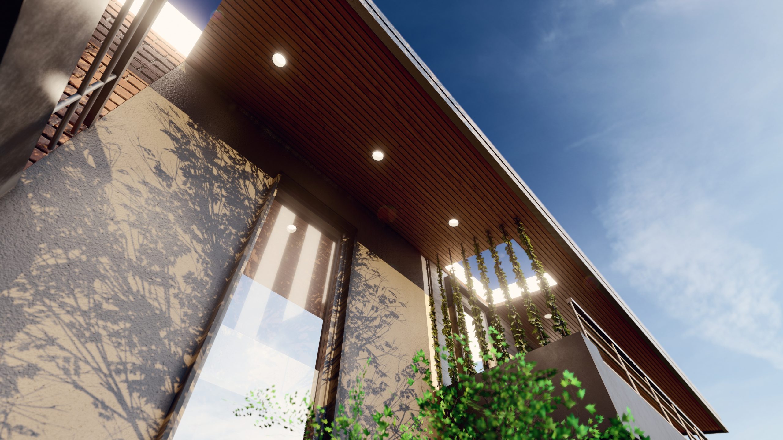 یکی از نکات برجسته این طراحی، ایوان گستردهی طبقهی دوم با سقف معلق و نورپردازی مخفی است که علاوه بر زیبایی، سایهاندازی مناسبی را برای فضای داخلی فراهم میکند. نردههای فلزی مدرن و قاببندیهای سادهی پنجرهها نیز به سبک مینیمال پروژه تأکید دارند.
